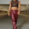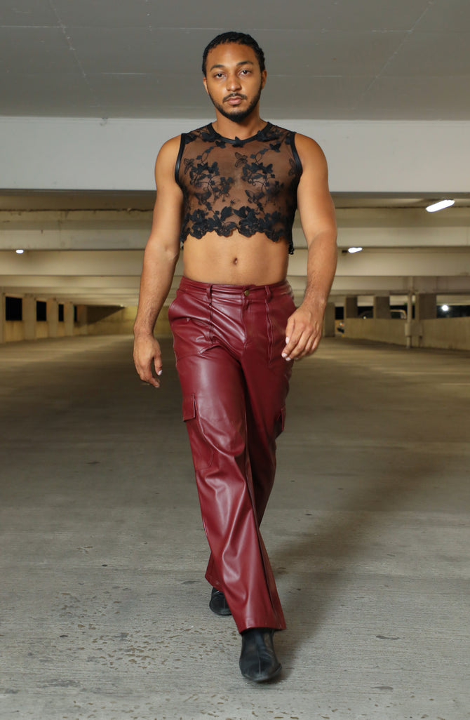 Celebrate sophistication with The Power Bottom Butterfly Lace Top. This men’s high fashion black lace top features ornate embellished butterflies and a luxe faux black leather trim. With its intricate design and luxurious details, it’s a statement piece for those who appreciate bold yet refined style.