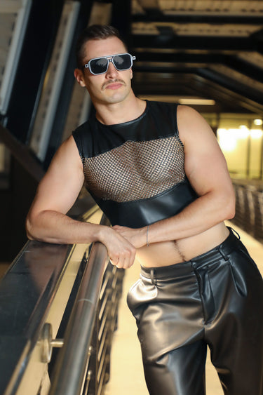 Embrace the spirit of Pride in The Summer Forecast Is Gay Leather Top. This men’s high fashion leather cropped top features a bold cutout in the chest area elegantly covered with sheer black fabric. With its sleek design and celebration of Pride, it’s perfect for making a memorable entrance wherever your night takes you.